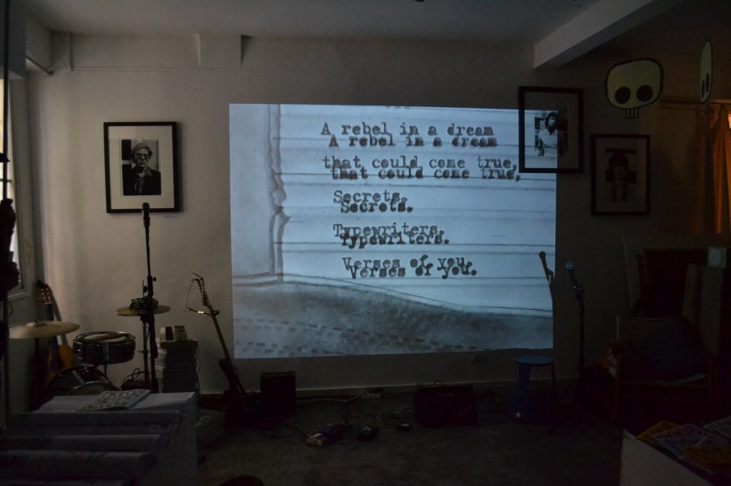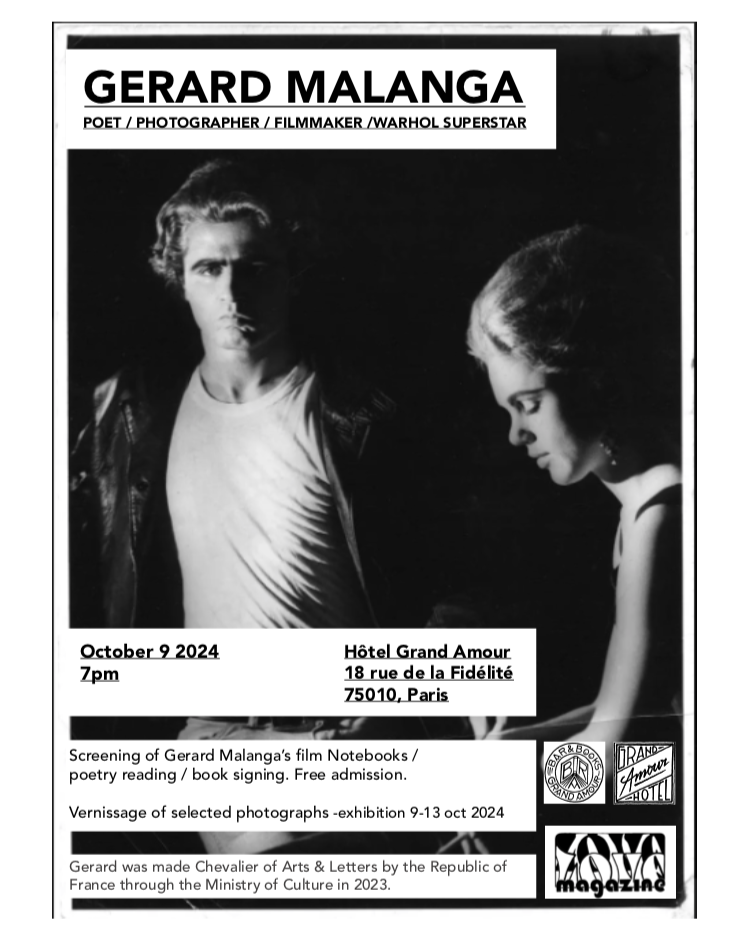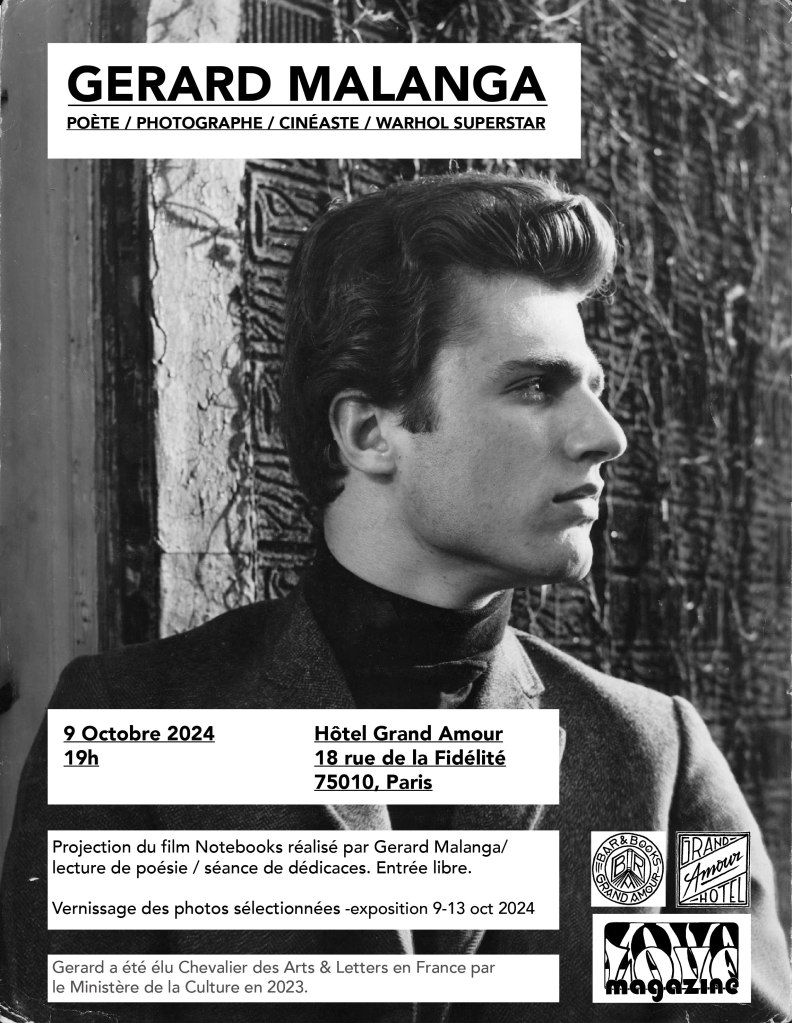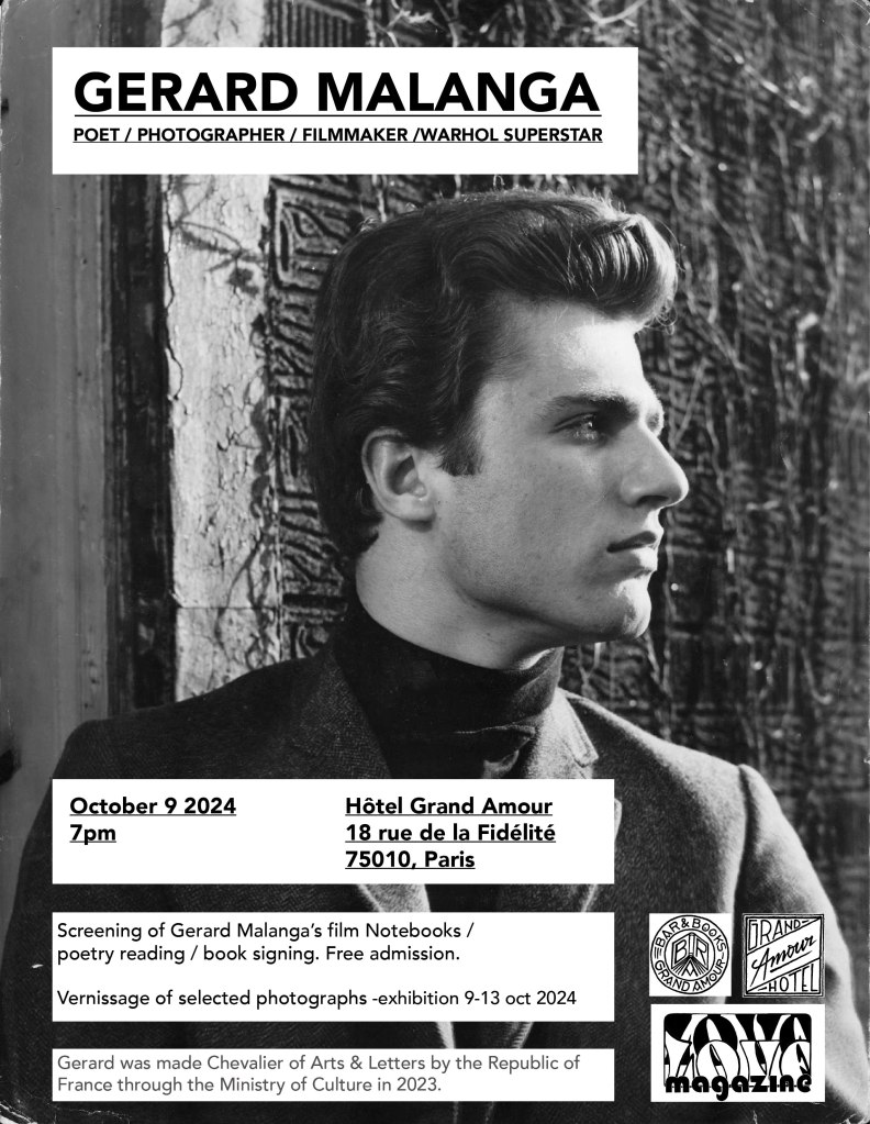 Gerard Malanga – exhibition at Bookbar – Hôtel Grand Amour – photos and film stills from The Factory days. Reading and film screening of “Gerard Malanga’s Notebooks”. October 2024.